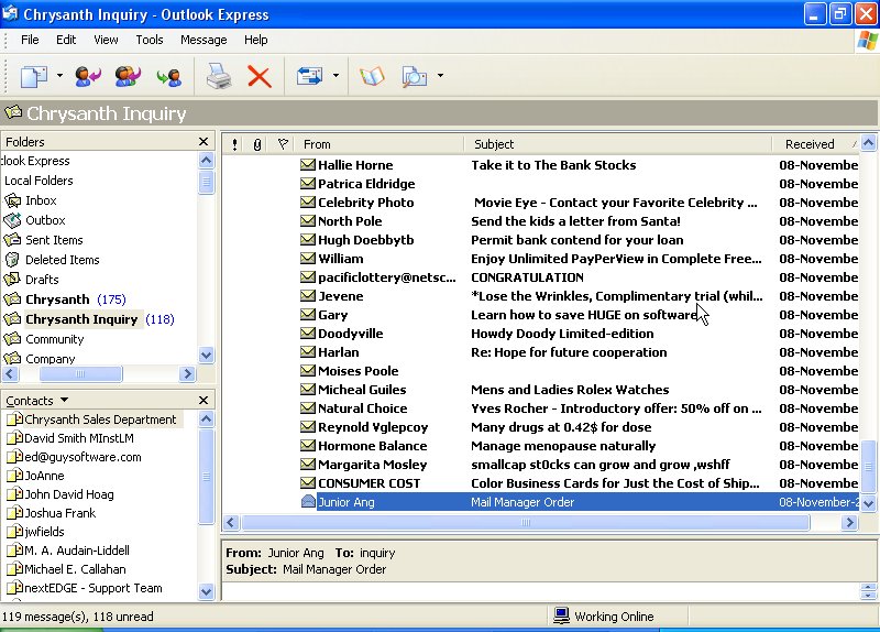 The screen of Outlook Express showing all the junk emails being downloaded from our Chrysanth Inquiry email account WITHOUT using Chrysanth Mail Manager to process those junk emails first.
