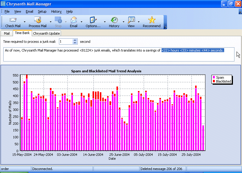See it yourself how much of your time being saved with every junk email successfully processed without even downloading them! Do you know how much time you could ever save with Chrysanth Mail Manager? ;)
